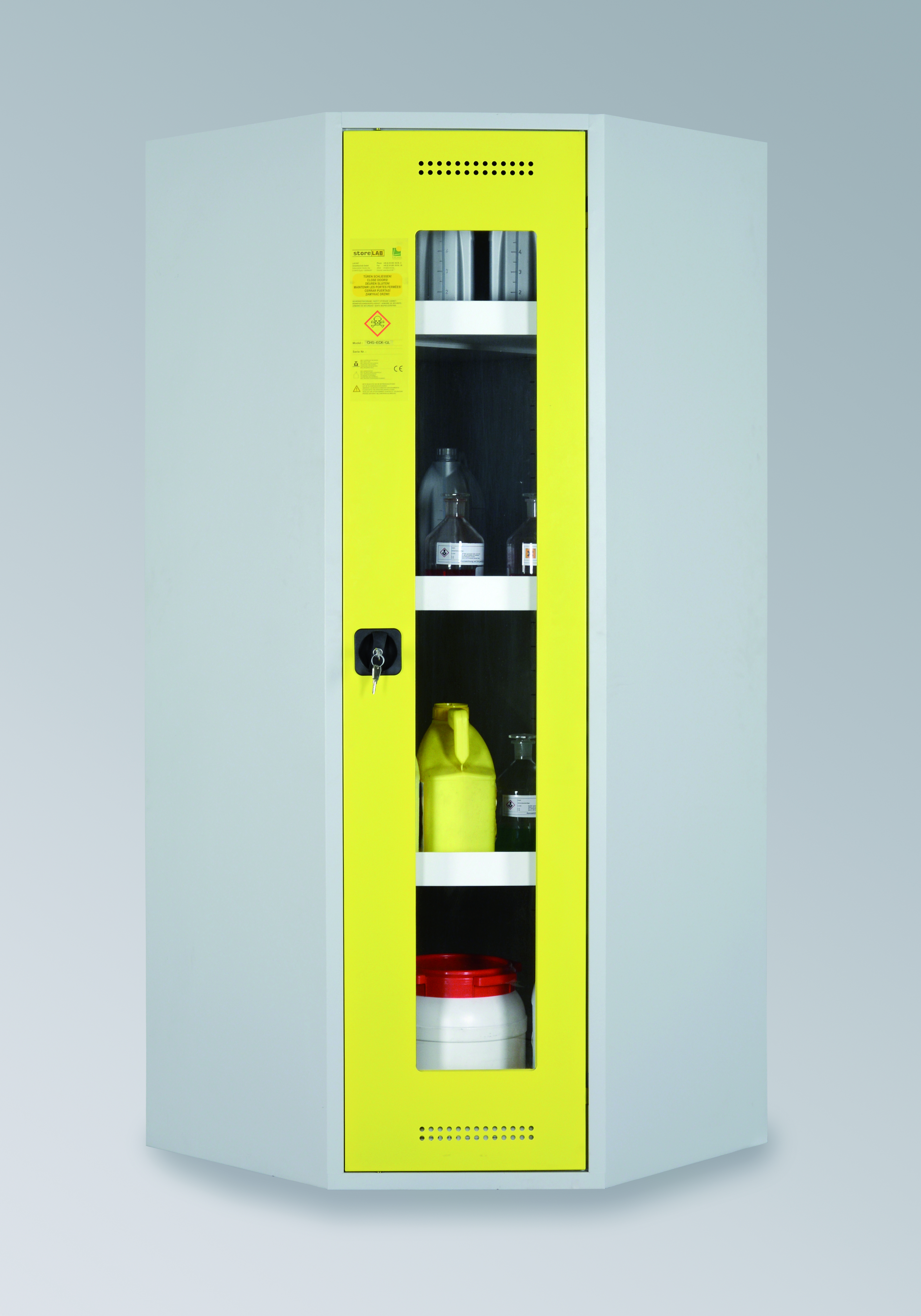 Start » Leistungen » Umwelt-Lagertechnik » Gefahrstoffschränke » Chemikalien- und Giftschränke » B80-6516-A (CHS-ECK-GL_RAL1018_Front_geschlossen)